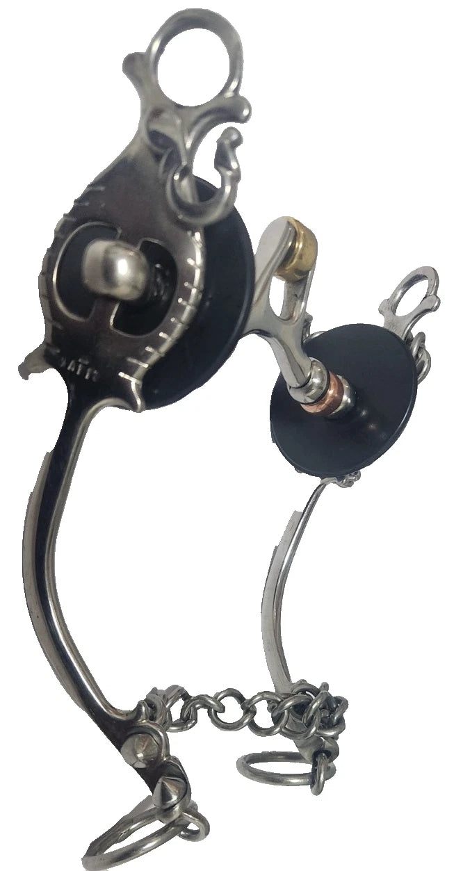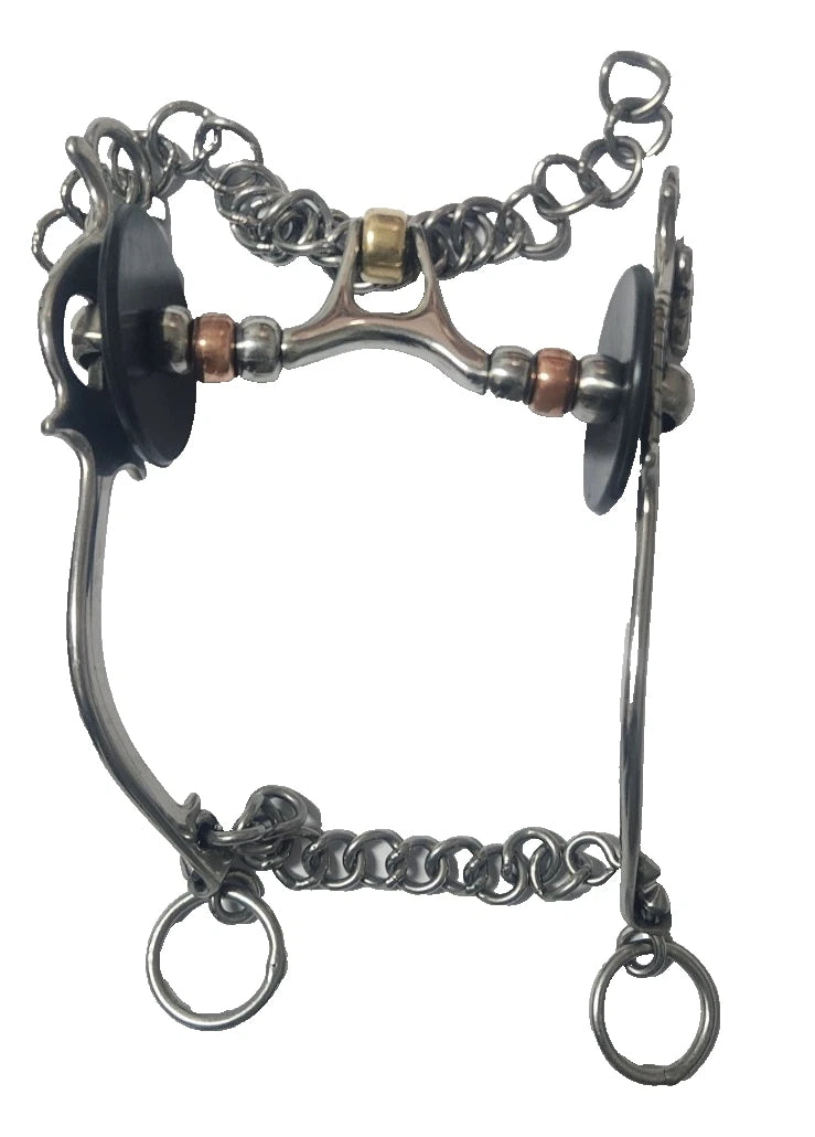 Special port with Carretilla style, C Shanks and steel roller in the sides, rubber disk at the ends of the port to give comfort to the horse. . Adjustable curb chain.