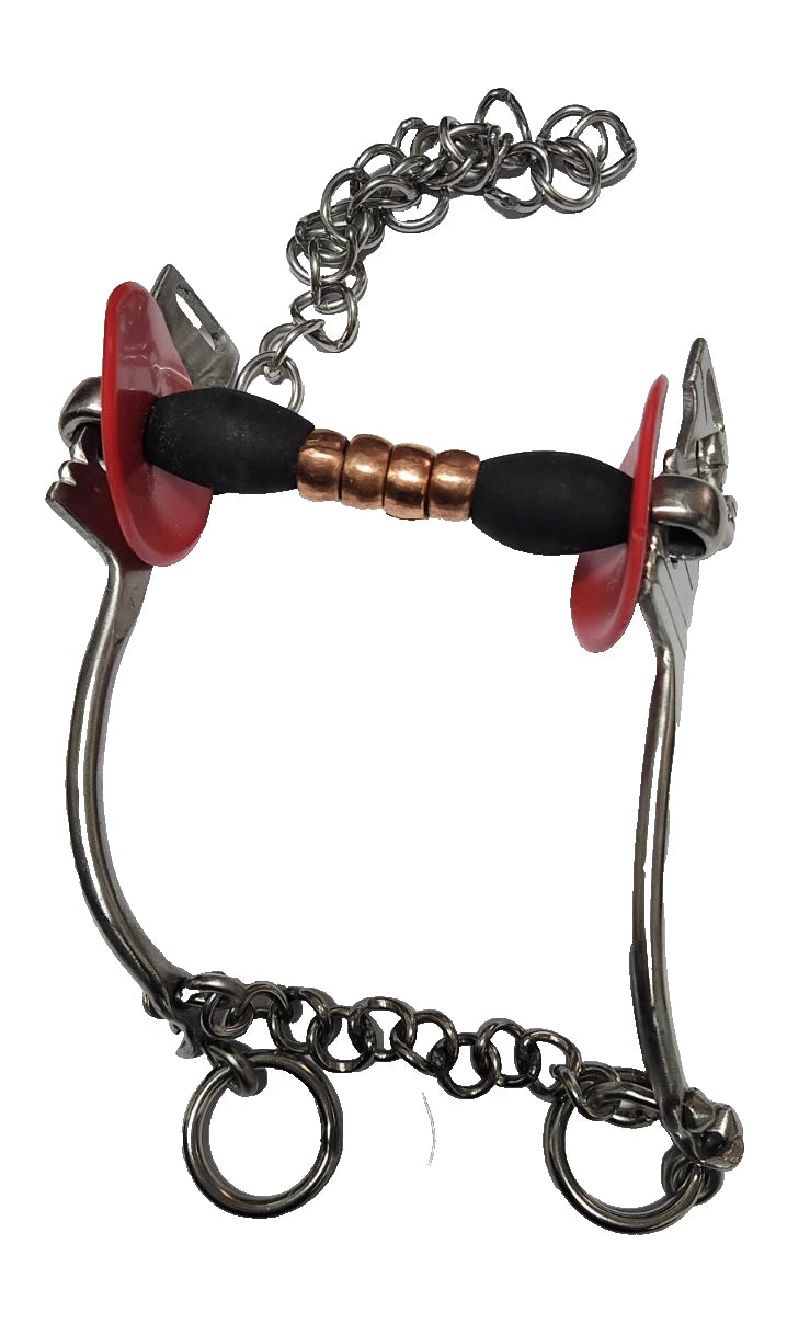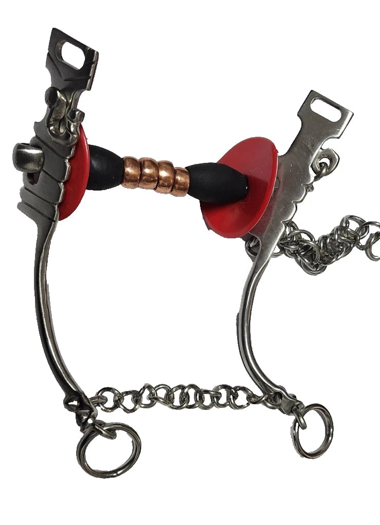 Beautiful 100% handmade by Colombian's craft masters, especially for the Paso Fino horse, perfectly constructed with the finest quality stainless steel. Bit with S Shank and Chair shanks, mouth bar with cooper, rubber barrels at the sides for comfort of the horse and rubber guards at the ends of the mouthpiece.