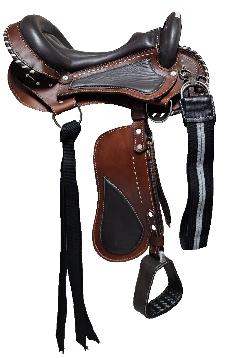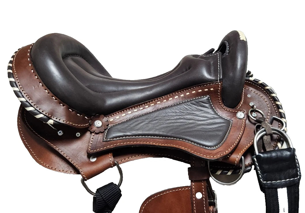 Beautiful trail or endurance saddle made with premium leather and stainless steel hardware, has double rigging and narrow gullets specially for Paso Fino horse, well-padded seat that offers comfort and support for the rider, the saddle has a short and rounded skirt for the comfort of gaited horse, weight around 16 pound.